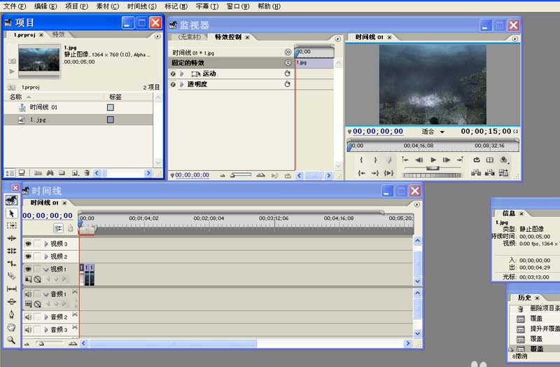1、首先啟動premiere7,新建一工程,在項目庫中導入一張素材圖片,將該素材拖拽到視頻1軌道上。
