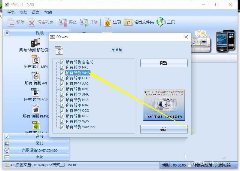6、最后還是要借助于格式工廠,來進(jìn)行格式的轉(zhuǎn)換,選擇WMA即可。
