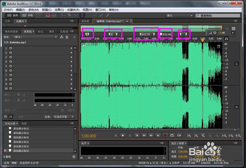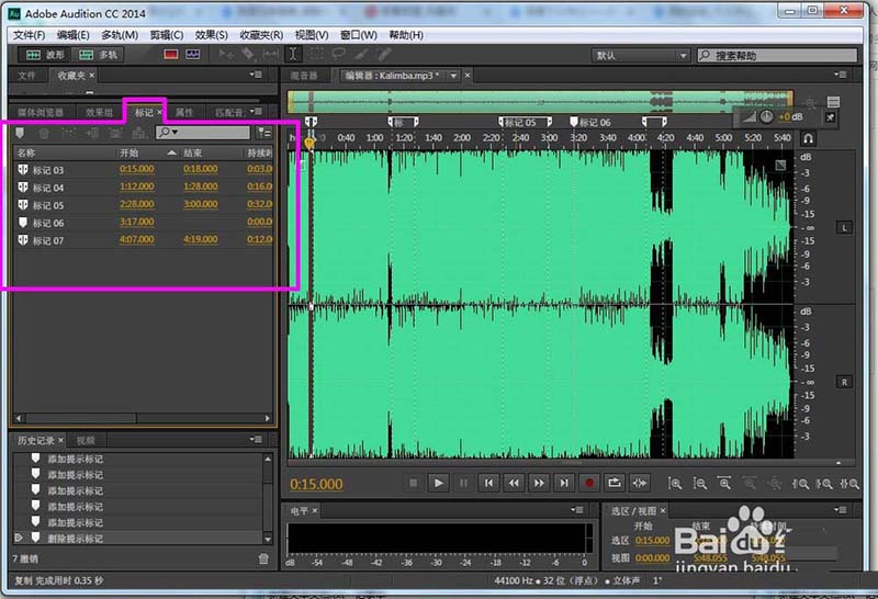 5、一段,一段的作標記。要修改時,可以點擊選擇“標記”的段進行修改。不用擔心時間軸的問題了。但是要記住標記是哪一段,最好事先把要改的段編好號。