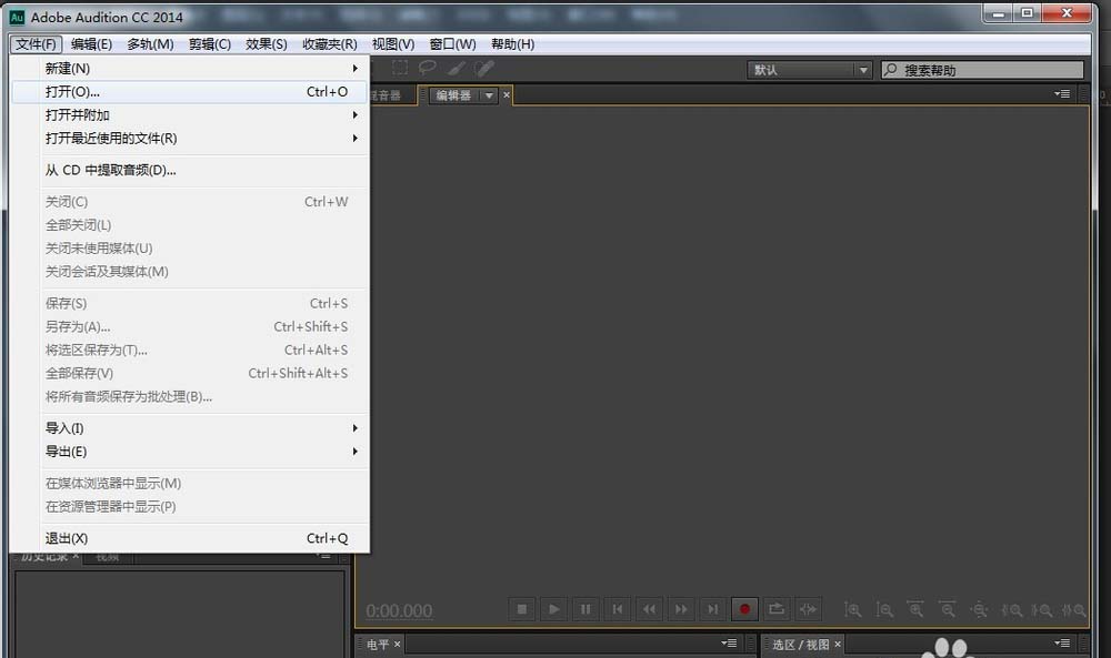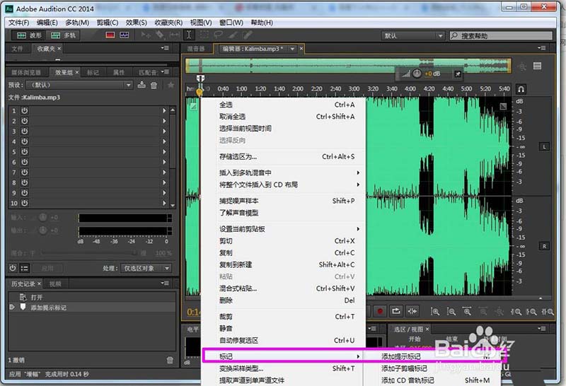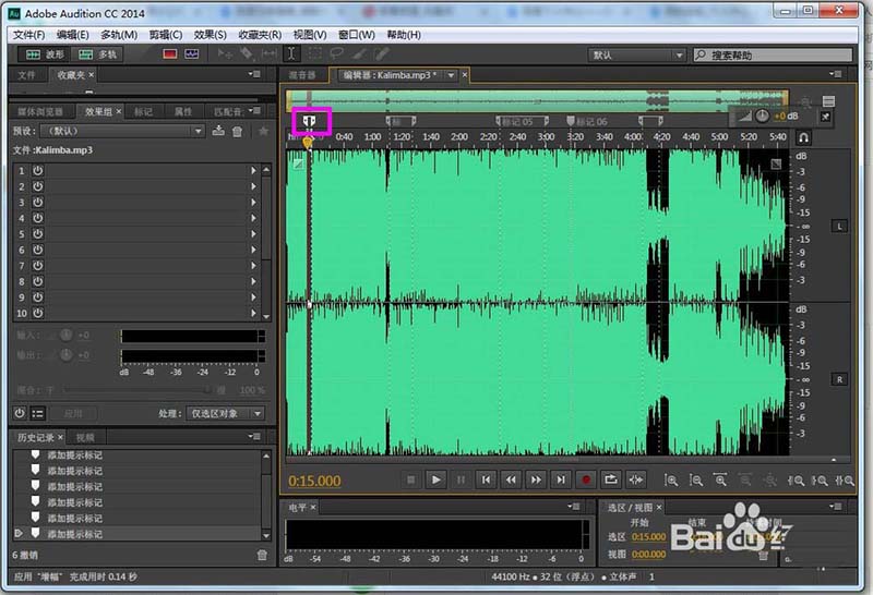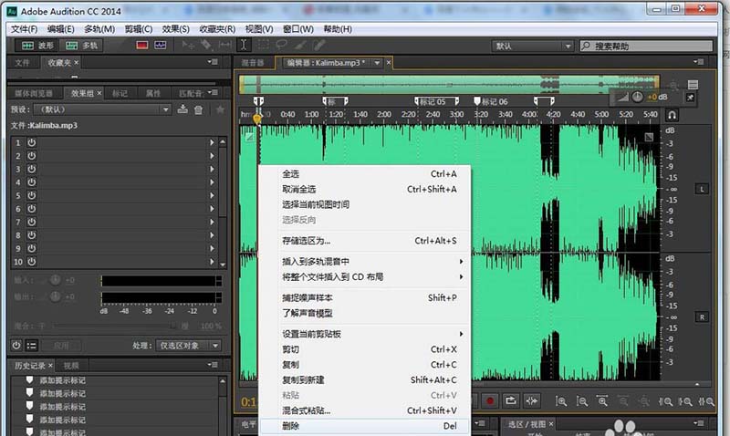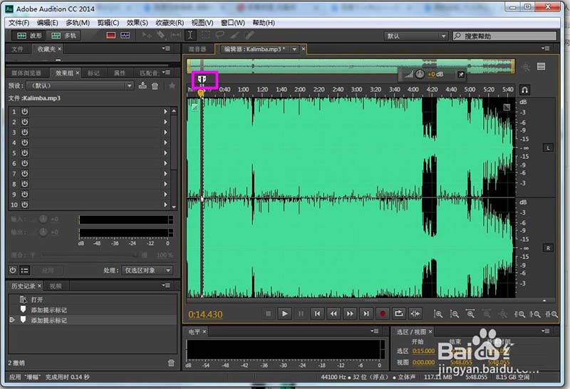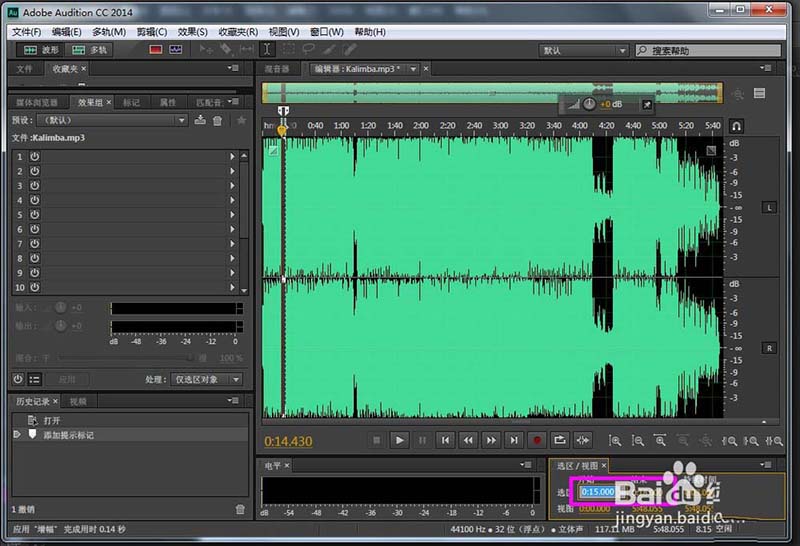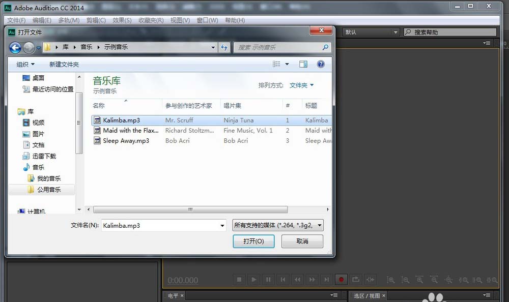 2、打開Audition cc,找出并打開要修改的音頻文件(Kalimba.mp3)。