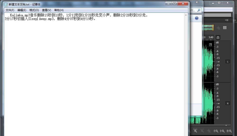 1、客戶要求你按這樣進行修改,“Kalimba.mp3音樂刪除15秒到18秒,1分12秒到1分28秒處變小聲,刪除2分28秒到3分處,3分17秒初插入Sleep Away.mp3,刪除4分07秒到4分19秒。”