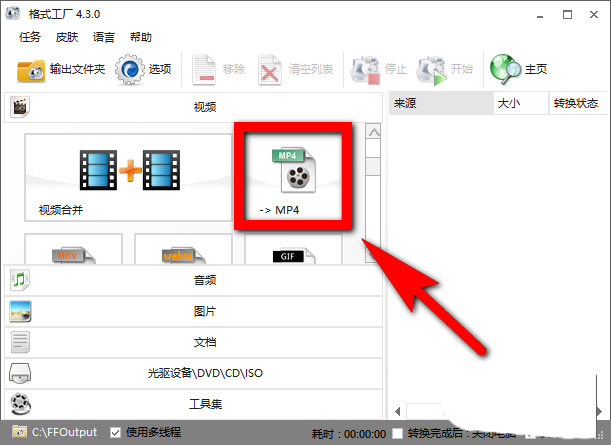 3、轉(zhuǎn)化文件格式需要使用到格式化工廠軟件,如果電腦之前未安裝那么就需要立即下載安裝一個(gè)。打開(kāi)格式化工廠軟件,在軟件主頁(yè)圖示位置點(diǎn)擊MP4按鈕。