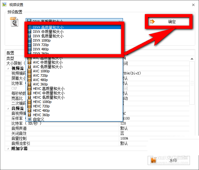 7、點(diǎn)擊輸出配置以后,出現(xiàn)圖示頁(yè)面,點(diǎn)擊下拉箭頭出現(xiàn)下拉列表,在列表中選擇DIVX格式,然后點(diǎn)擊【確定】。