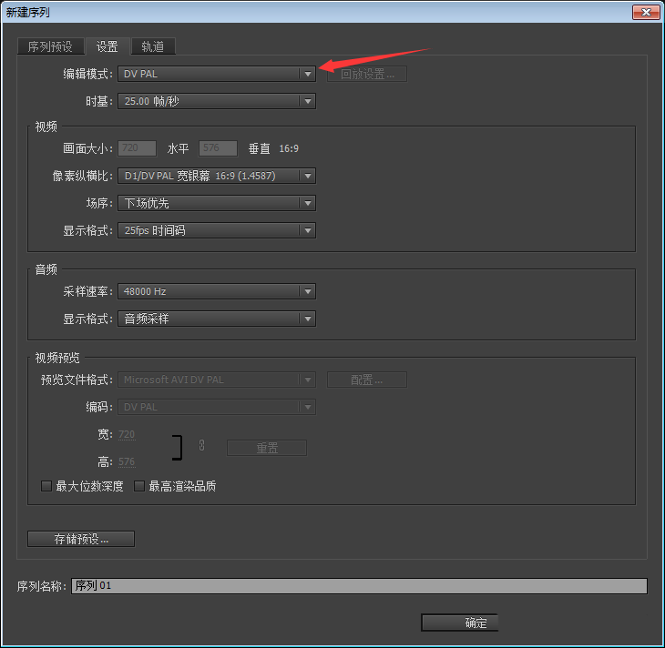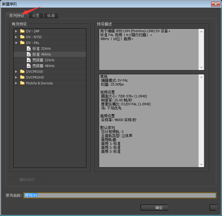 2、首先進入的是這樣的界面。序列設置中有很多預設的序列,常用的序列設置是DV-PAL標準48KHz