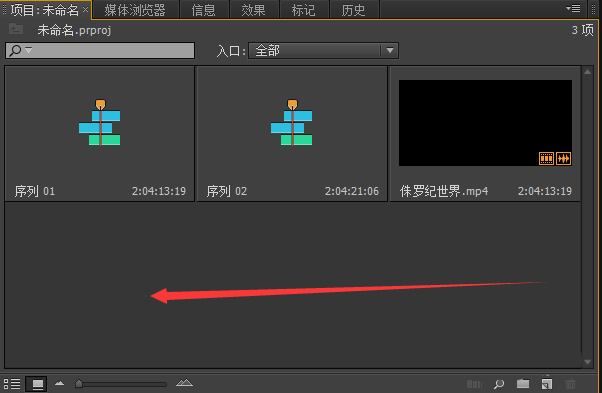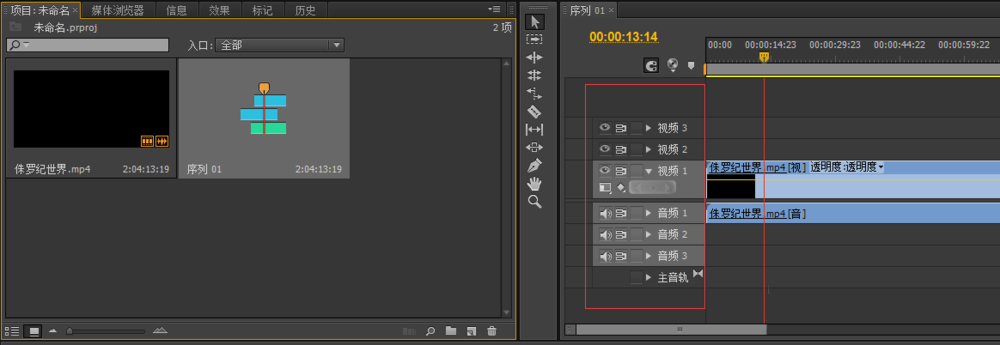 8、點擊確認后就可以進入pr編輯畫面了。單擊剛才建立的序列,可以看到由視頻層和音頻層組合出來的序列文件。