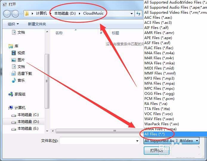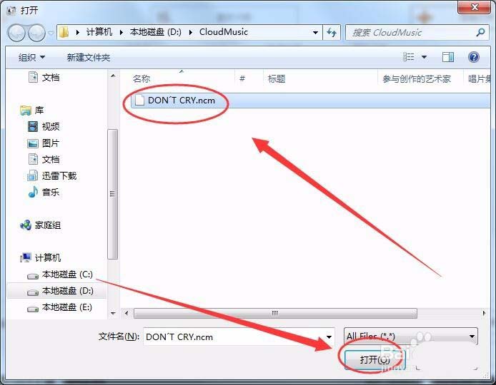 5、打開ncm格式音樂所在的目錄后,選擇文件名后的文件格式為All Files。