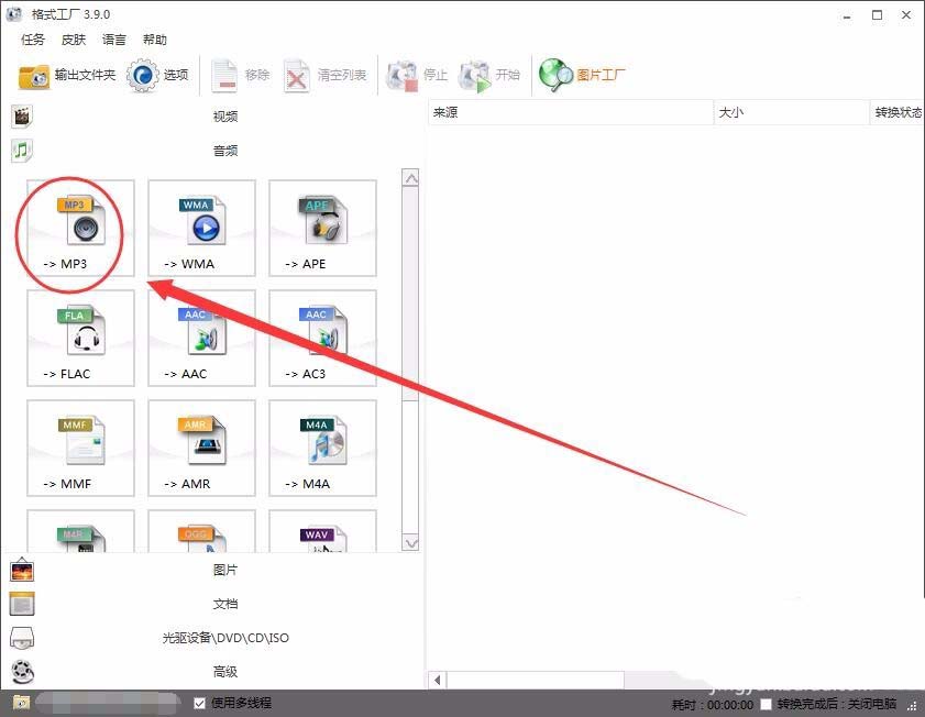 3、在音頻選項窗口中,選擇MP3按鈕。