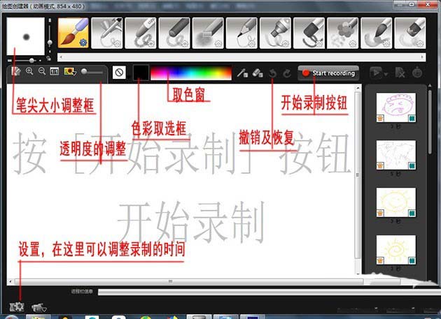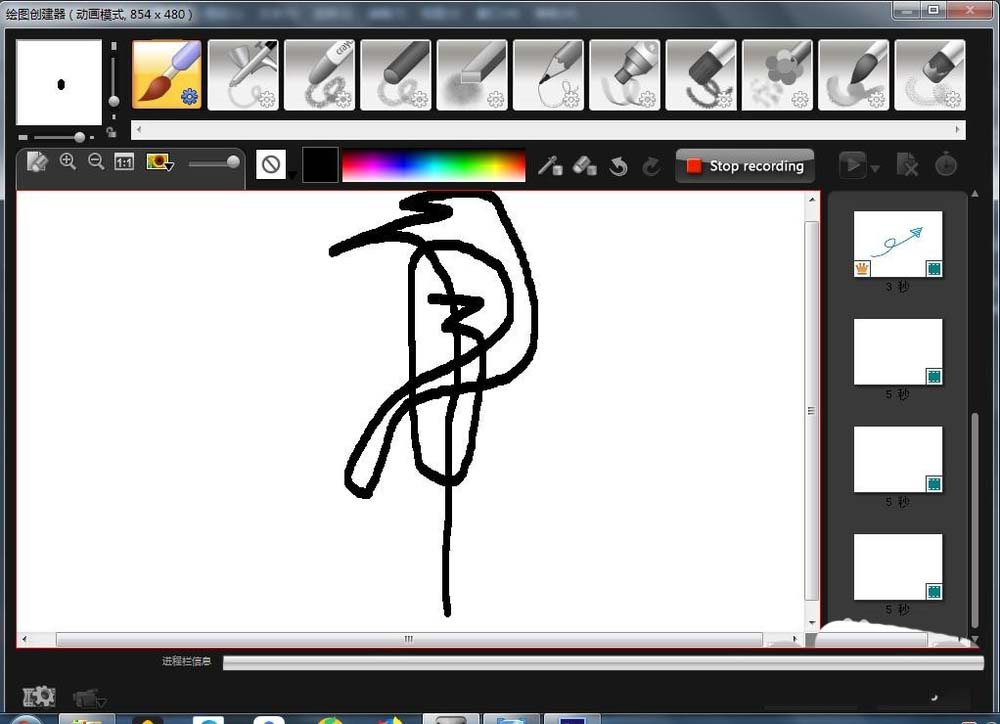 5、現在我們實際操作,我們畫一個一筆的“鳥”,調整好和顏色及筆尖的粗細,點擊開始錄制按鈕,點擊后開始按鈕由圓形變成方形。