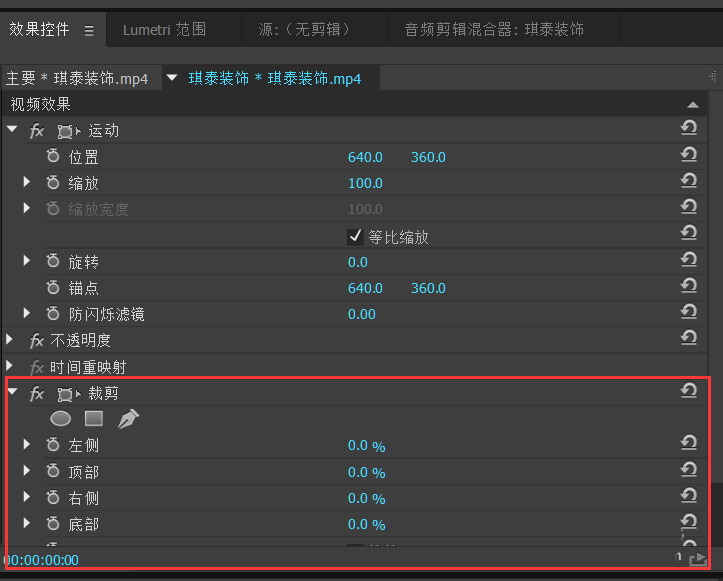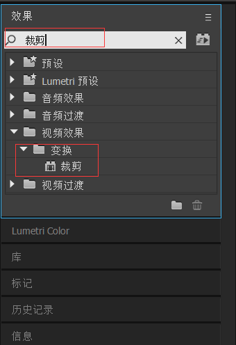 6、把裁剪特效拖到時(shí)間軸的素材上,會發(fā)現(xiàn)效果面板有裁剪了。