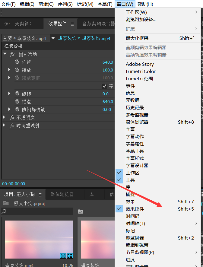 3、如果沒有,說明沒有打開面板,點(diǎn)擊窗口-效果控件或者快捷鍵都可以。