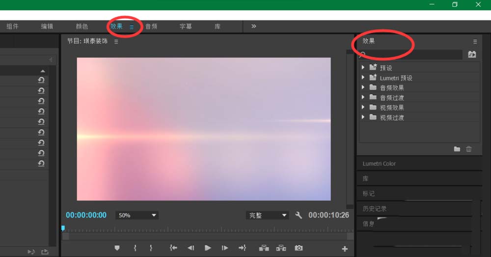 1、拖入素材,在時(shí)間軸面板中點(diǎn)擊一下,否則不會效果面板沒有內(nèi)容