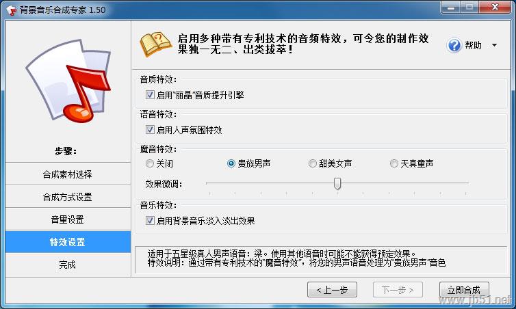 帶有專利技術的“魔音”特效,可在一定程度上為您解決當前真人語音包的種類不夠豐富,音色單一的問題,您只需安裝男、女聲各一種五星級真人語音,“魔音”特效即可為您變化出多種不同音色和聲音。在“背景音樂合成專家”的最新版本中,我們支持“貴族男聲”、“甜美女聲”、“天真童聲”等完全不同的新語音,令您選擇余地更多,可滿足不同場合的需要。您可選擇具體采用哪種音色,并可進行效果強弱的微調,往左調整時效果減弱,往右調整時效果增強;