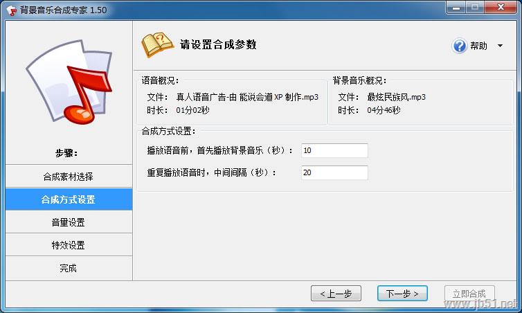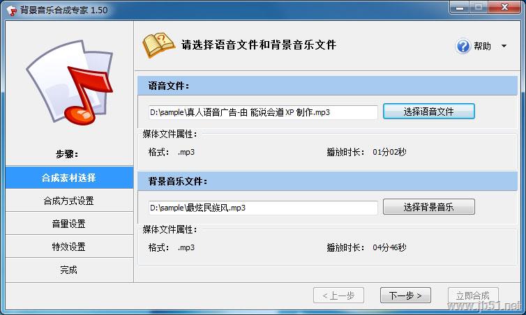 1、選擇語音文件及希望添加的背景音樂文件,目前“背景音樂合成專家”可支持MP3及波形(WAV)兩種格式的媒體文件,選擇好合適的文件后,該文件的基本信息將會顯示,例如文件格式,音樂/語音播放時長等,完成后按“下一步”;