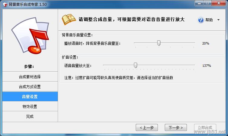 3、背景音樂合成專家在合成背景音樂時,可任意調節合成音量,并可支持對語音進行擴音,在語音開始播放時,如果音樂聲較大,將會影響到語音的聆聽,因此,在播放語音時,背景音樂將自動降低音量,您可調整此時背景音樂的音量大小,背景音樂合成專家內置擴音器功能,當您的語音音量較小時,您可以對語音音量進行放大,100%表示不進行任何放大,大于100%時表示進行放大,小于100%則表示減小音量;