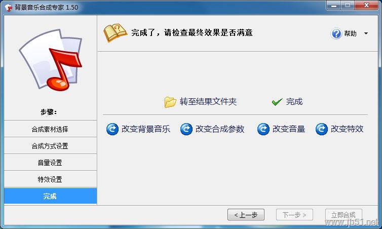 6、合成完成了,您可點擊“轉至結果文件夾”來找到最終合成的MP3文件,可以使用您的播放器來試聽合成效果,如果并不滿意,您可繼續進行調整,例如“改變合成參數”、“改變音量”、“改變特效”,甚至“改變背景音樂”,如果對合成效果滿意,則直接點擊“完成”按鈕,可以繼續合成其他語音。