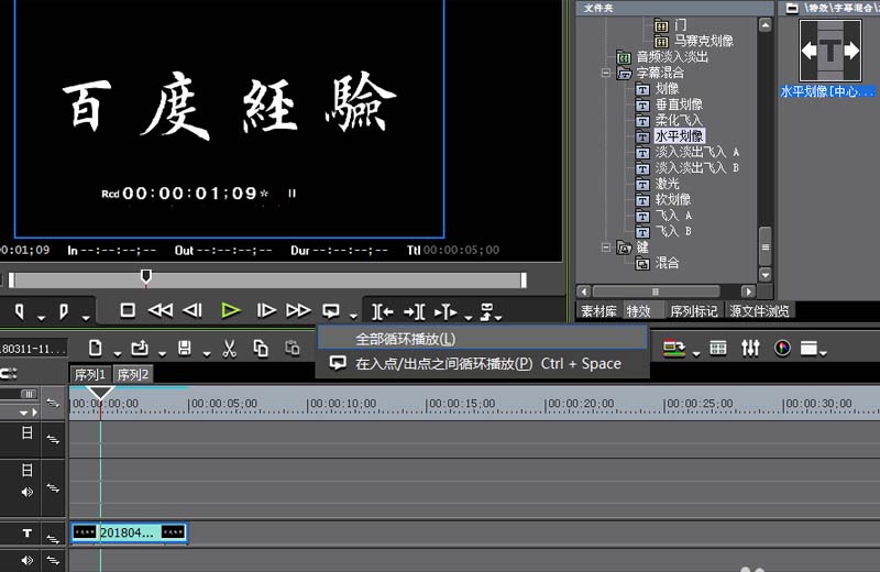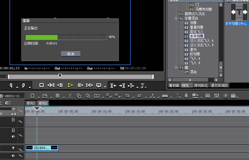 4、從特效庫中選擇字幕混合,接著選擇水平劃像中的水平劃像(中心),分別拖拽t軌道上字幕開始和結束位置。