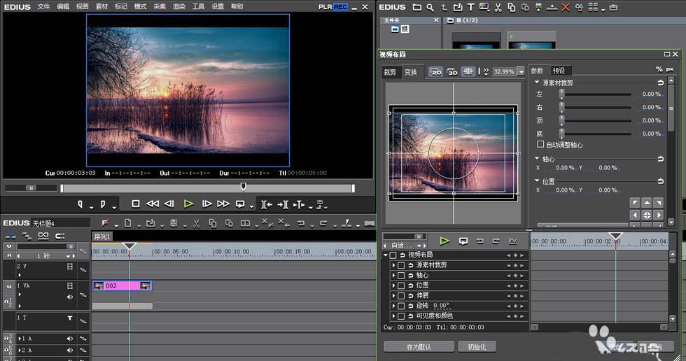 6、點(diǎn)擊確認(rèn)之后,就會(huì)返回EDIUS源文件,時(shí)間線上的素材會(huì)發(fā)生布局的變化,我們可以用視頻布局來(lái)更改顯示模式