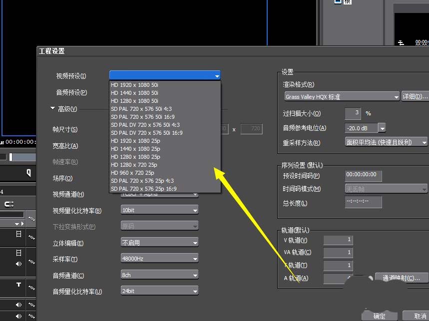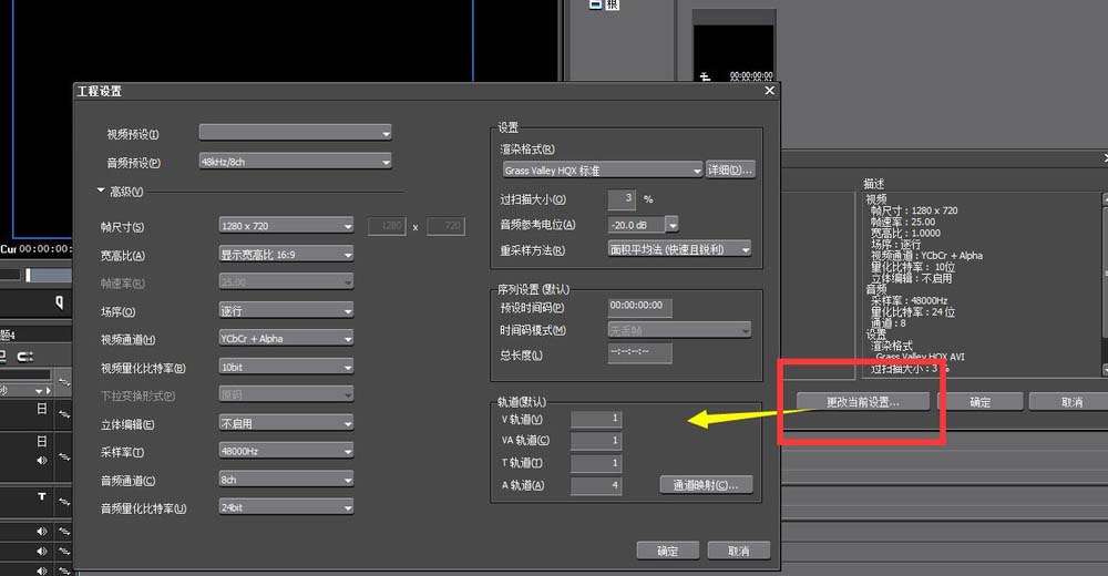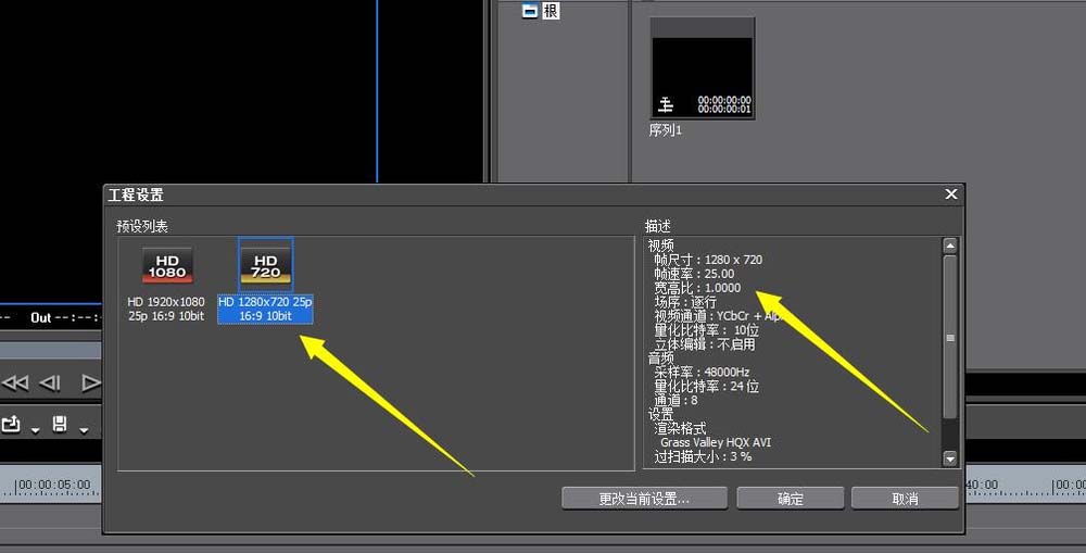 2、在這個(gè)界面顯示的是當(dāng)前的EDIUS制作的使用尺寸,右側(cè)描述里面是詳細(xì)信息