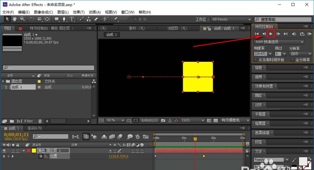 9、這樣一個簡單的動畫就做好了,點擊右上角預覽控制臺中的播放按鈕,就可以看見一個運動的黃色方塊了。