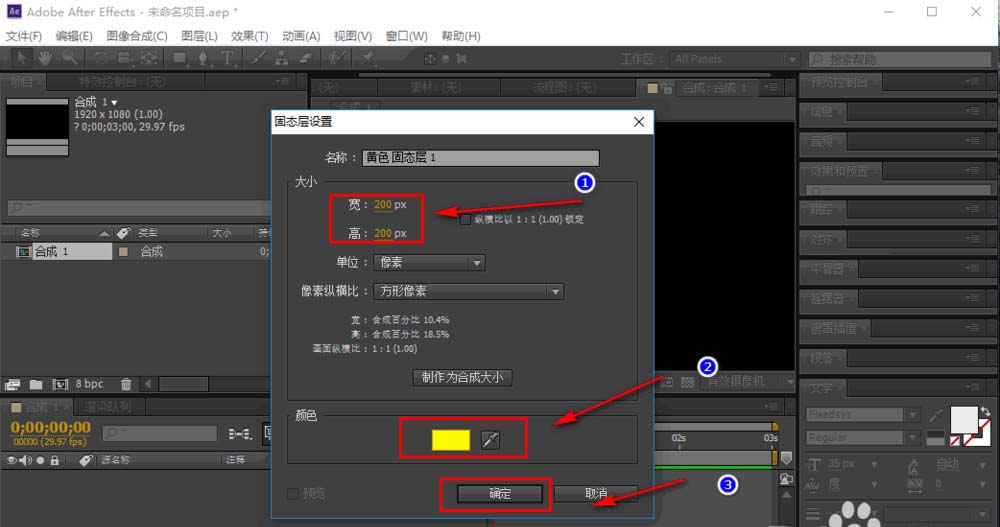 4、在彈出的固態層設置中,設置寬高為200px,選擇顏色為黃色,點擊確定