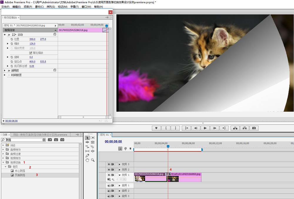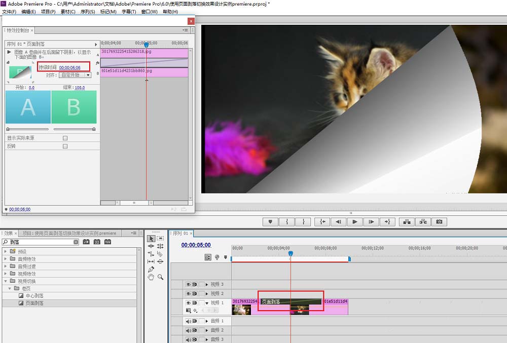 4、將頁面剝落效果填加到素材之間,如圖所示。