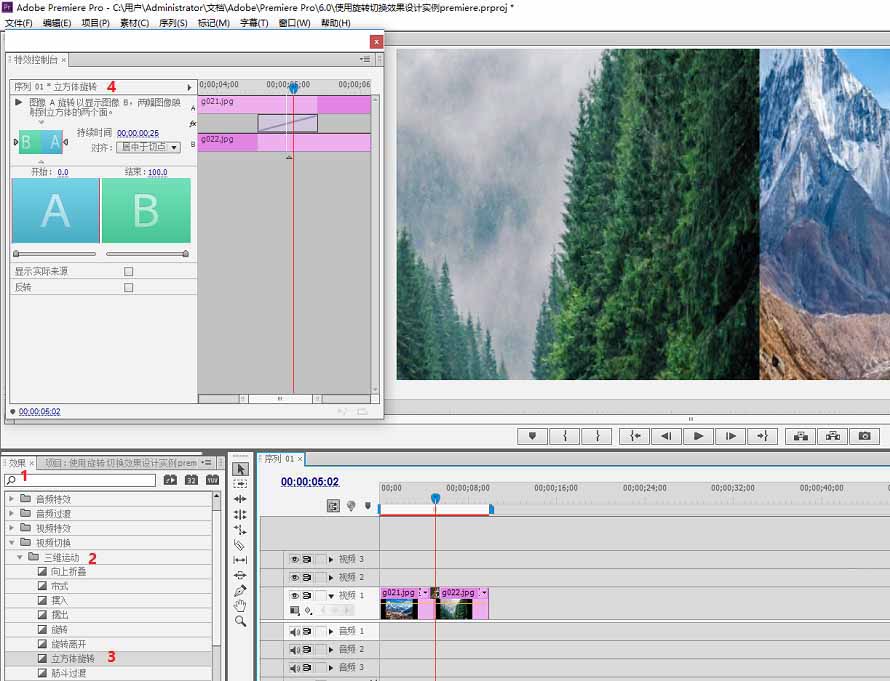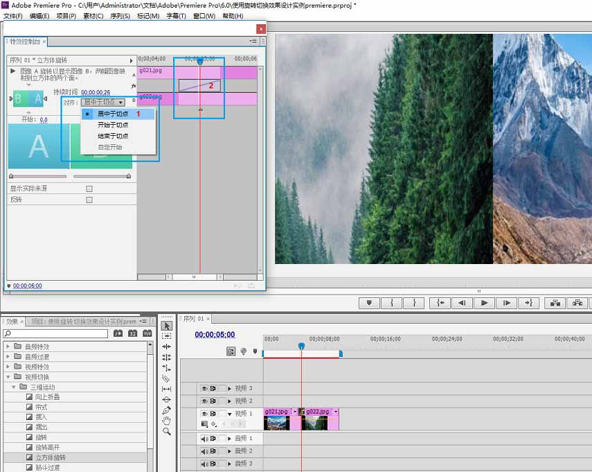 3、將立體旋轉切換效果添加到兩張素材圖片之間,如圖所示。