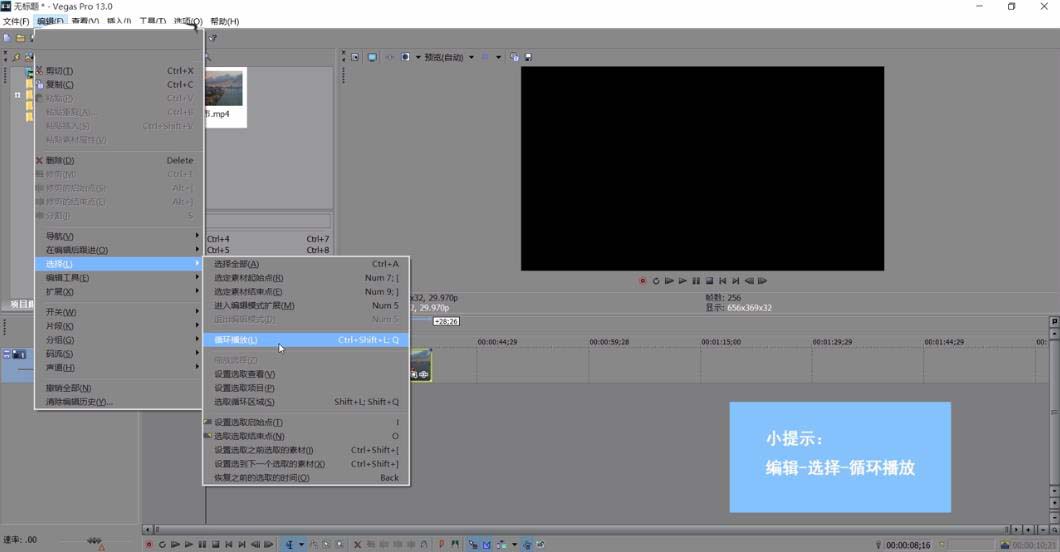 2、點擊“編輯”中的“選擇”,找到“循環(huán)播放”。