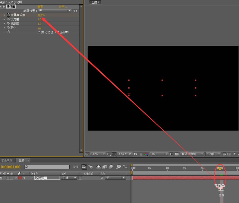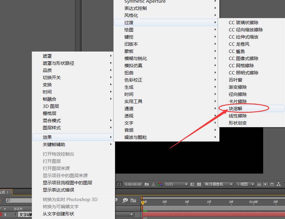 1、選擇文本圖層,右擊鼠標選擇“效果>過度>塊溶解”,為文本添加溶解動畫效果。