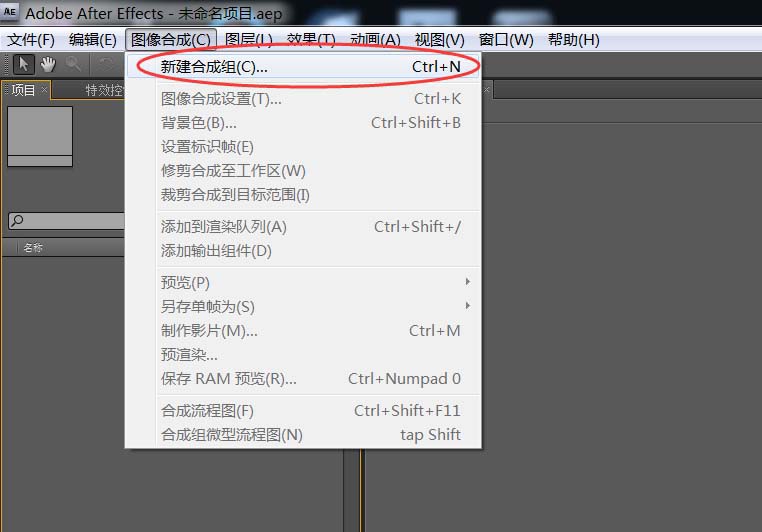 1、通過執行:圖像合成>新建合成組命令,快速的建立一個新合成。