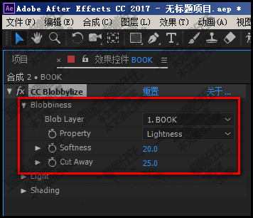 2、選中:BOOK層;然后,添加效果:扭曲--cc blobbylize