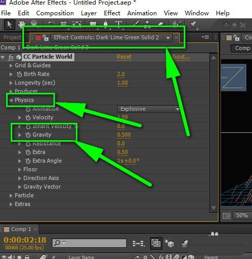 5、如圖所示,在AE特效控制面板中找到physics菜單下的重力gravity即可哦。