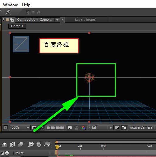 3、把之前搜索的內置粒子拖動到第一層固態層即可在預覽面板中看到效果了。如圖所示,這個就是AE粒子特效的中心點了喲。