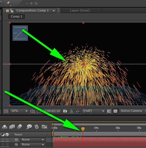 4、然后我們稍微拖動時間線即可看到粒子的發射效果了哦。但是大多數的粒子都是往下掉落的哦,所以我們應該設置一下從而讓粒子發散開來。