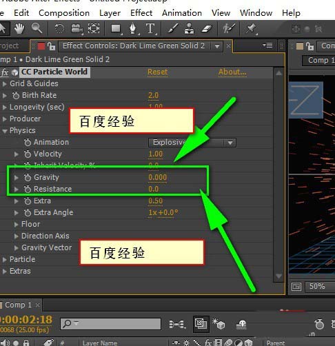 6、把這個重力gravity的參數設置為零便可以讓AE粒子發散開來了哦。