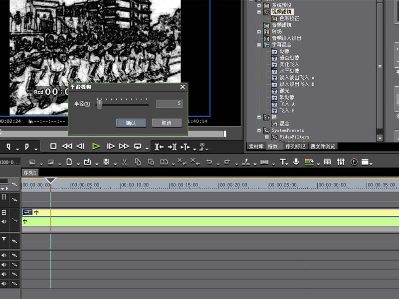 5、接著拖拽平滑模糊到視頻軌道上,調出平滑模糊對話框,設置半徑為5像素,點擊確定按鈕。