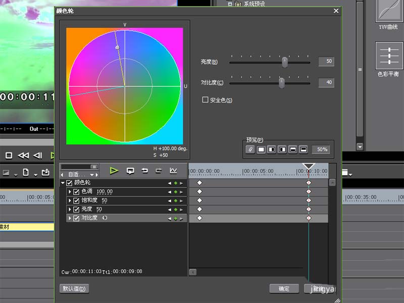 5、選擇第八秒處添加關鍵幀,設置色調為100,飽和度為50,亮度為55,對比度為40.點擊確定按鈕。