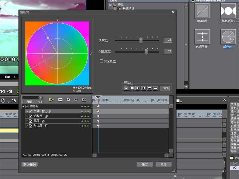 4、接著點擊添加關鍵幀,設置色調為120,飽和度為20,亮度為25,對比度為57.