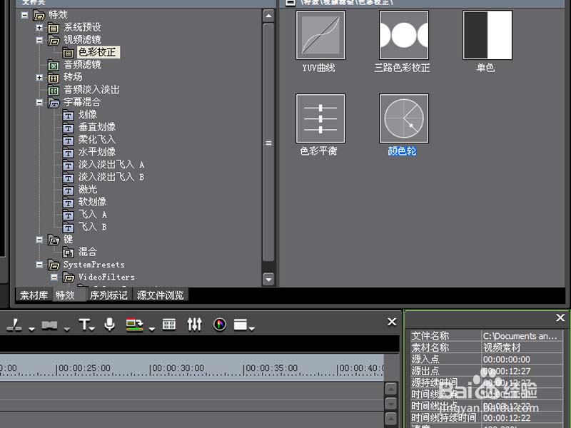 2、從特效庫中選擇視頻濾鏡,接著從右邊的窗口中找到顏色輪,并拖拽到視頻軌道上。