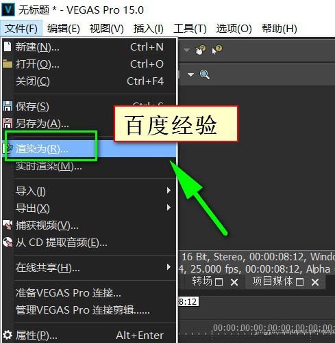 5、在vegas中渲染視頻則是用到文件菜單中的“渲染”按鈕的。