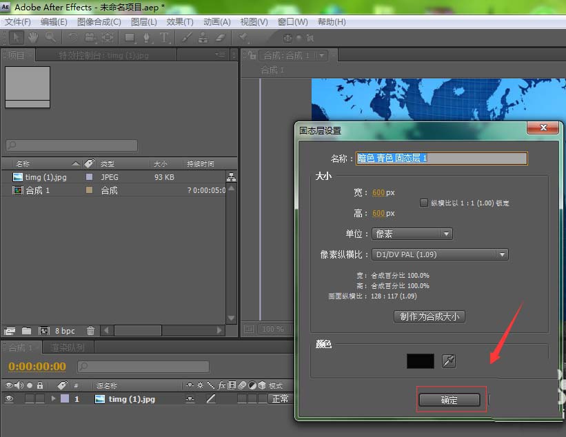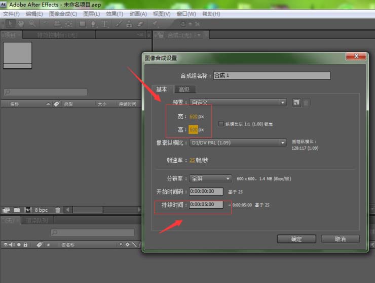 1、打開ae,新建一個600x600的合成,持續時間為5秒,其他默認即可