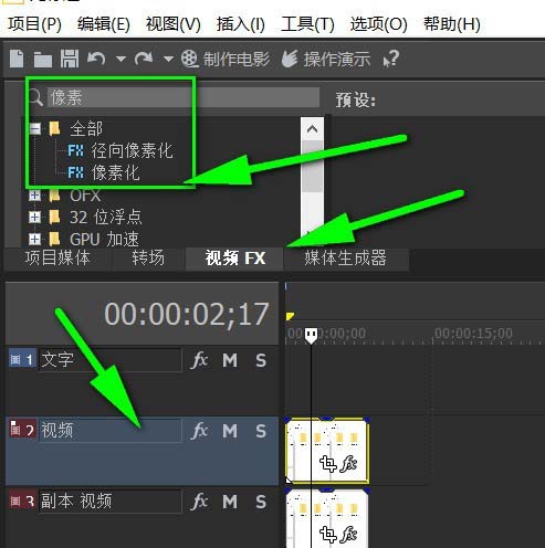 5、如圖所示,在“視頻fx”中找到“像素化”特效拖到視頻上即可。“像素化”特效表示的就是馬賽克特效了。