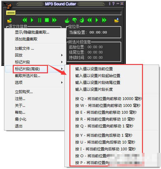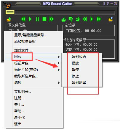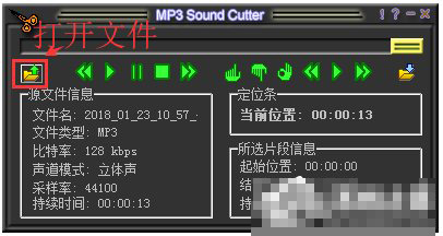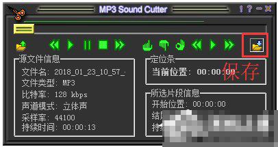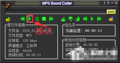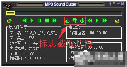 1、MP3 Sound Cutter使用很簡單,大概就是加入——選取——輸出這樣的步驟,如果您不知道上面圖標按鈕的意思,將鼠標放在上面就可以看到文字解釋