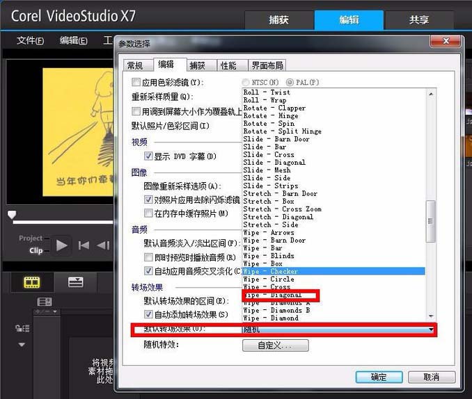 5、接下來選擇默認的轉場效果,軟件里自帶會有多種效果,點擊后邊的隨機選項就可以具體選擇,當然默認隨機也是可以的,看自己的風格愛好,都設置好之后點擊確定。