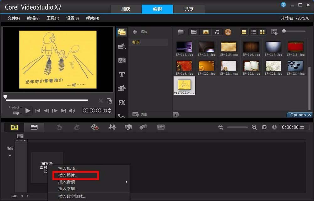 6、接著回到軟件界面的故事版視圖,在添加圖片視頻的方框那里右擊鼠標,然后就會彈出插入的選項,這里選擇插入照片或是視頻,也可以選擇素材的欄的圖片,直接選中要添加的照片,然后拖動好下面的編輯窗口即可。