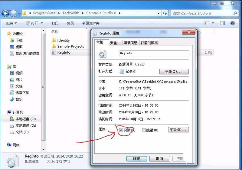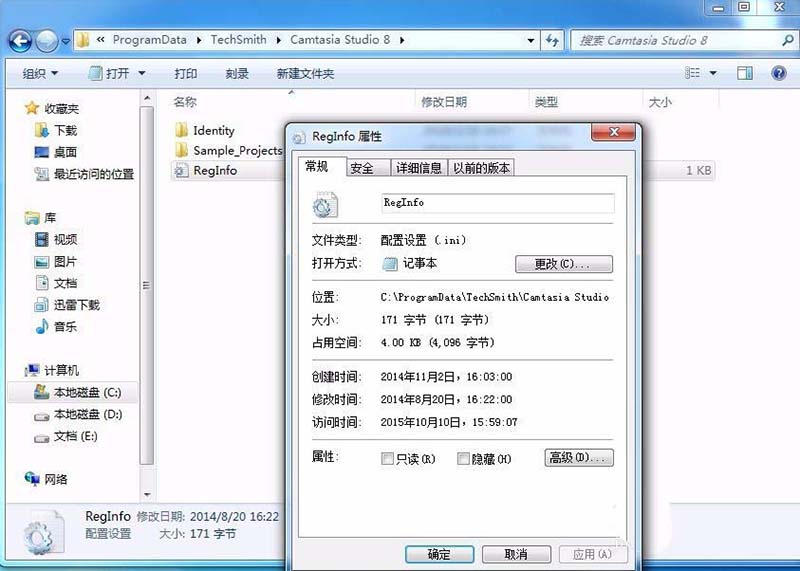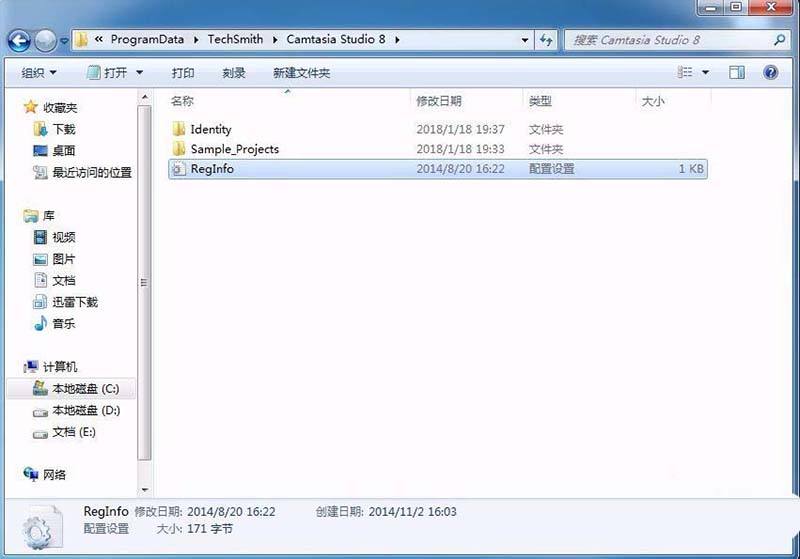 1、為了方便起見,可以輸入Win7系統(tǒng)"%ProgramData%/TechSmith/Camtasia Studio 8/RegInfo.ini"到文件目錄中,找到RegInfo.ini。XP系統(tǒng)可以輸入“%AllUsersProfile%/Application Data/TechSmith/Camtasia Studio 8/RegInfo.ini”到文件目錄中,找到RegInfo.ini