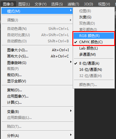 4、使用菜單“圖像→模式”,我們發現此PSD文件使用的是“CMYK顏色模式”。而CMYK顏色模式的psd文件導入AE是不分層的。這就是原因所在。