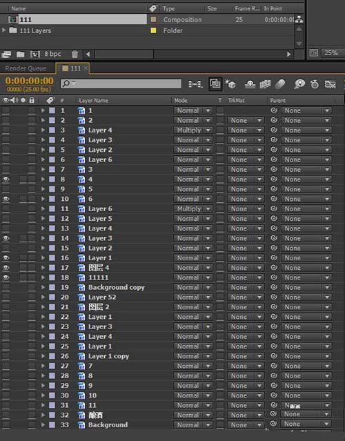 7、打開合成111我們就看到了分層的文件。