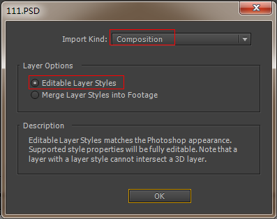 6、按Ctrl+S重新保存psd文件。這時候再把“111.PSD”導入AE。這時候就自動出現提示框了。如圖所示,點擊OK,就成功導入PSD分層文件了。