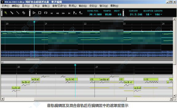 音軌編輯是Vocaloid3特色之一,可以通過WAV倒入音頻文件,來進行對軌,可以用來做合 成,扒譜等工作。可以通過復制分軌使用混音器及VST插件制作壓限/延時/混響的后期合成效果。