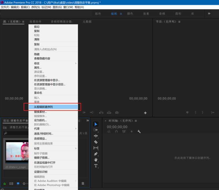 4、選擇新導入的視頻素材,右鍵單擊,選擇從剪輯新建序列。